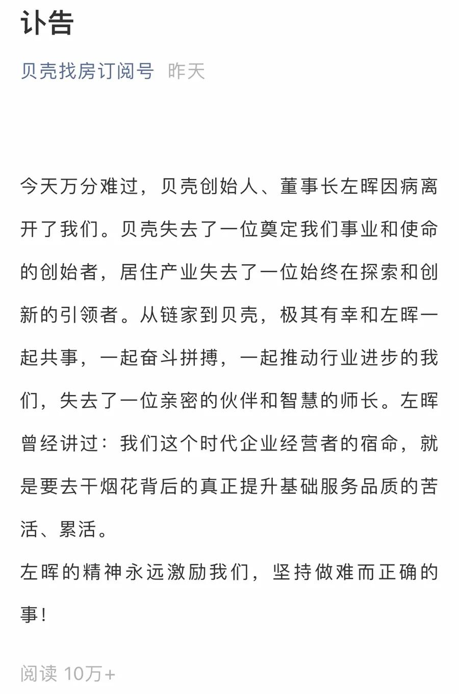 5月20日,贝壳找房发布讣告,称:“今天万分难过,贝壳创始人、董事长左晖因病离开了我们。”消息突然,迅速登上热搜。