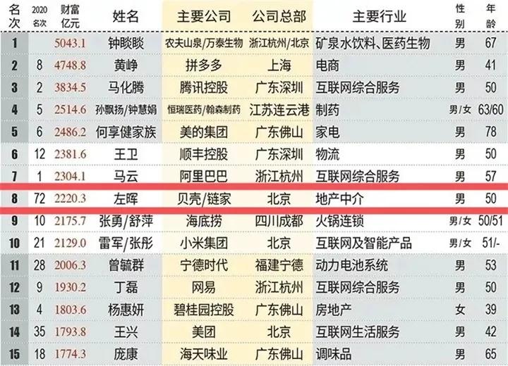 公开资料显示,左晖1971年1月生人,年仅50岁。就在一周前的5月13日,新财富刚刚发布了“2021新财富500富人榜”,贝壳左晖取代了此前的杨惠妍及许家印,成为新一任地产首富。